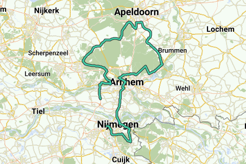 De standaard ANWB route Zuid Veluwe uitgebreid met Posbank, Arnhem Centrum, Nijmegen, Berg en Dal en Groesbeek.