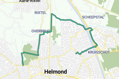 Ga na de brug direct RA de trap af en LA het PIET VAN BOKHOVENPAD op, loop deze helemaal uit en ga RA JANUS MEULENDIJKSPAD en loop deze uit tot aan het kanaal.