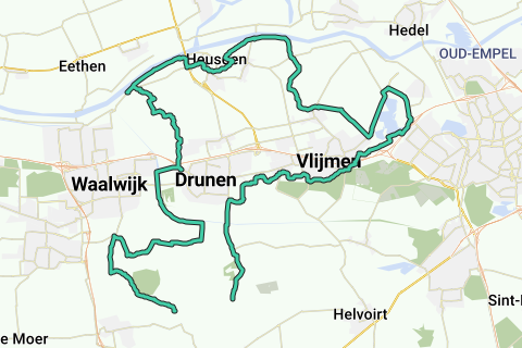 Van Rustende Jager via Haarsteegs Wiel en Maas naar Heusden. Dan verder langs Maas naar Waalwijk, door de Loonse en Drunense Duinen naar de Rustende Jager