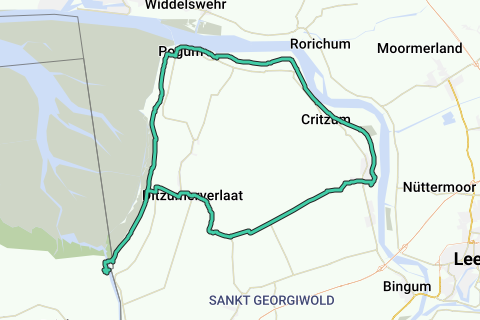 van Nieuw Statenzijl, de grens over en langs de dijk naar o.a. Ditzum en Jemgum. Blik over de dijk naar de Dollard en de Ems, kijkje bij de Emssperrwerk, mooie vissersdorpjes als Ditzum en Jemgum