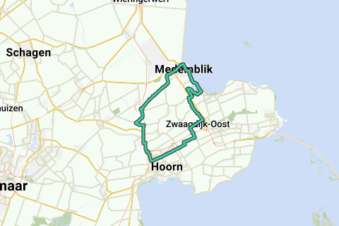Leuke route. Begint op parkeerplaats Pejo in Hoorn. Leuk stukje door "De groote Vliet" bij Onderdijk. Via Medemblik (leuke terrasjes...), Opperdoes en Twisk (prachtige huizen) uiteindelijk weer terug in Zwaag....
