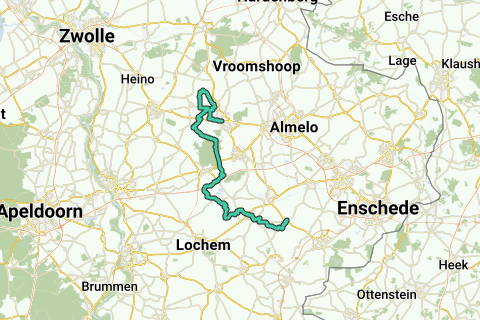deze prachtige route van bijna 65 kilometer begint in nijverdal, waarna men vrijwel meteen de bossen infietst. Men fietst vrijwel de gehele route door een schitterende groene, bosrijke omgeving. Er zijn prachtige panorama's. onderweg zijn er mogelijkheden om iets te drinken en/of voor versnaperingen. De tocht eindigt in Hengevelde, bij café de Gebrande Waateren. Een oude herberg uit 1799, waar u nog steeds de oude herbergsfeer kunt proeven. Deze plek is een prima optie om uw fietstocht af te sluiten met een kop koffie en krentenwegge, een heerlijk diner of gewoon lekker met een kop ouderwetse groentensoep.