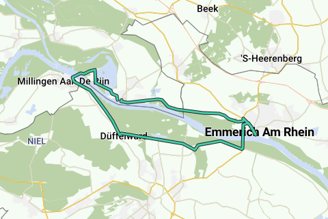 Deze fietstocht van 33 kilometer start in Tolkamer. De route voert ons over fietspaden en dijken langs de Rijn. Eerste stop voor koffie, thee of een ijsje kan zijn op de Rheinpromenade in Emmerich. Een aanrader is ook het Rheinmuseum met de historie over de Rijn en het gebruik daarvan. Daarna gaan we terug naar de route en steken de Rijn over via de langste hangbrug in Duitsland. Het stukje over de Oraniendeich is even taai, maar al snel slaan we rechtsaf naar Griethausen. In Griethausen staat een oude spoorbrug. Lang geleden sloot deze route aan op het spoorwegnet, tot aan Berlijn toe. De Rijn werd met een speciale treinveerpont overgestoken. Over dijkjes komen we aan in Millingen aan de Rijn. Bij het informatiepunt kan wat gedronken worden alvorens we de Rijn oversteken met het veerpontje "heen en weer". Via de Bijland keren we terug in Tolkamer. Veel fietsplezier!