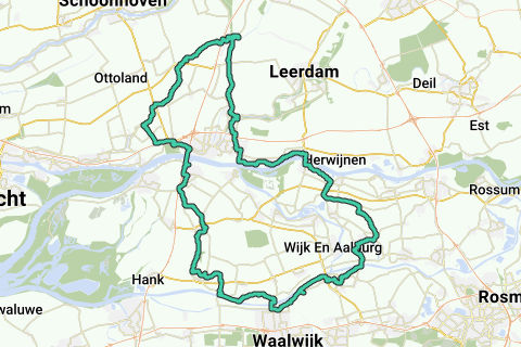 Route langs slot Loevesteijn en Fort Vuren, vervolgens naar Heusen. Na Heusden naar Heesbeen en Doeveren over de dijk langs de Maas. Dan richting Drongelen naar Dussen. Via Korn, Almkerk en Uppel terug in de richting van Meerkerk