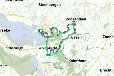 De route start ter hoogte van het belastingkantoor aan de Laan van Brabant in Roosendaal en voert via Tolberg centrum richting de Wouwse Plantage. Achterlangs de camping en over een bosrijk fietspad via deels onverharde weg naar de A58. Parallel hieraan en vervolgens richting 't Appeltje. Door Heimolen en een stukje Bergen op Zoom (Antwerpestraatweg) naar de Bergse plaat. Om de Binnenschelde heen, vervolgens richting Woensdrecht via Walkant en Non Plus Ultra. Rechtsaf en meteen links via de Zomerbaan en een lange onverharde weg naar Calfven. Naar Hoogerheide en via een mooi bospad naar Huijbergen. Richting Wouwse Plantage en voor café Trapke Op rechtsaf naar Nispen en er doorheen. Via Watermolenbeekpad naar de President Kennedylaan en terug naar het belastingkantoor in Roosendaal.