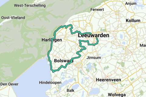 Route van 123 kilometer langs Harlingen en Makkum. Eind- en startpunt Leeuwarden
