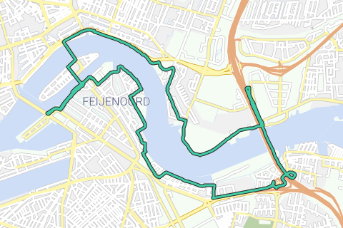 Over Brienenoordbrug zoveel mogelijk langs Maas lopen. Terug over Willemsbrug