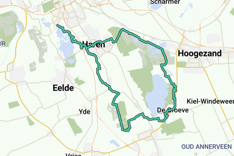 Knooppuntenroute: Start bij de J Wagenaarstraat in Groningen naar KNP 04 en vervolgens via 26 - 27 - 75 - 77 - 78 - 28 - 25 - 52 - 53 - 55 - 64 - 66 - 61 - 87 - 81 - 78 - 84 27 - 26 - 04.