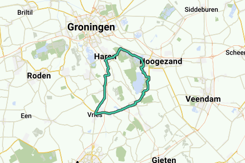 Vanuit Haren oostwaarts naar Waterhuizen. Voor de spoorwegovergang en het Winschoterdiep rechtsaf door de 'wetlands' naar Meerwijk - de Groeve - Zuidlaren. Westwaarts verder naar Tynaarlo en Vries en dan noordwaarts naar de Punt en terug naar Haren