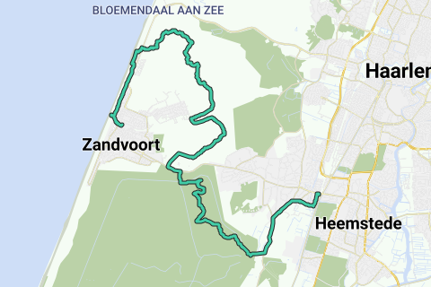 Vanaf station Heemstede-Aerdenhout via Alvernaweg naar duiningang De Oase. Door Waterleidingduinen over Rozenberg en Torenblink naar uitgang Zantvoortselaan. Richting Zandvoort en Visserspad tussen Zandvoort en Overveen - ongeveer kustpad volgen. Paadje langs fietspad. Bij Visserspad voor spoorlijn naar links. Daarna tunneltje onder spoor nemen. Aan andere kant eerste pad naar rechts. Via Wisentenpad / gele route over Kraansvlak (Wisentengebied). Na verlaten hiervan gele route verder volgen tot op boulevard. Langs strand naar Zandvoort. Horeca bij strandpaviljoen (bijv. Thalassa). Station. totaal 17,5 km.