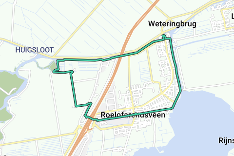 Start Langeweg, Roelofarendveen. RD naar Oude Wetering via Plantage, Veerstraat en Kerkstraat. Einde LA en voor de doorgaande verkeersweg Alkemadelaan RA, het viaduct onder de brug door, LA via de Googhermolenweg langs de molen, RD over fietspad. Aquaduct over en verder langs de Ringvaart naar Nieuwe Wetering. Via de Noordveenweg RA en langs de Ringvaart blijven lopen. Het pad voet u langs woonboten, kronkelt langs de Hanepoel en eindigt bij de Moppenmolen. Terug bij de Y-splitsing RA en langs de sloot blijven lopen. RA de Bovenweg op. In de bocht van de Bovenweg RD Korte Oostweg, aan eind LA Molenweg; aan het eind Achterweg schuin oversteken; RD tussen de huizen door tot RA Voorweg. Aan het einde LA, viaduct onderdoor naar Westeinde. RD naar de watertoren met tulp naar de Langeweg.