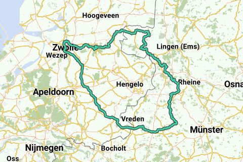 379 km Vanuit Zwolle naar het ontstaanspunt van de Overijsselse Vecht in Eggerode. Terug via Winterswijk en Lochem, daarna route terug naar Zwolle.