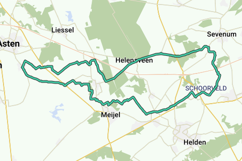 Vanuit Heusden gaat het richting Neerkant en achterdoor naar Meijel. Via een goed befietsbare natuurweg van 100m lengte steken we het Deurnesch Kanaal over naar natuurgebied Het Kwakvors. Via Beringe en Koningslust gaat het richting Maasbree en buigt de route naar het noorden af richting Sevenun en vervolgens richting Toverland. Via Helenaveen en Neerkant gaat de track weer terug naar Heusden.