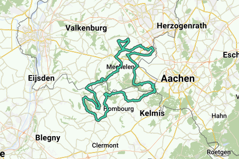Rondrit Heuvelland 22 vanuit Vijlen. Start/finish: boscafé 't Hijgend Hert, Rugweg, Vijlen. Beklimmingen: Kruisberg zuidoost Nijswiller 1.000 m., max. 12,0%. Trintelenberg Eys 2.100 m., max. 7,0%. Plettenberg oost Eys 800 m., max. 8,0%. Schweiberg Mechelen 2.700 m., max. 9,0%. Schilberg Slenaken 1.200 m., max. 12,0%. Magis St. Pieters-Voeren (B) 2.900 m., max. 7,0%. Kasteelstraat Teuven (B) 1.200 m., max. 10,0%. Rue Les Trois Bornes Gemmenich (B) 2.200 m., max. 6,0%. Camerig oost Vaals 2.800 m., max. 12,0%. Hoogtemeters 1.238. Koffiestop: brasserie Het Rode Bos, Varnstraat 17, Remersdaal (B) (dagelijks geopend).