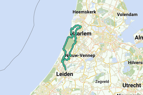 Prachtige route! via Noordwijkerhout naar Zandvoort en de Kennemerduinen, dan richting Santpoort en via Vogelenzang en Lisse weer terug naar Leiden