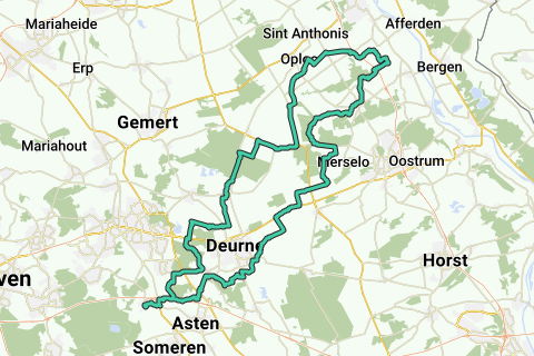 Aanpassing 7-4-2022: Om het slechte fietspad langs de Peeldijk in Milheeze te ontlopen is de route enigszins aangepast door Milheeze heen en door de boswachterij Stippelberg. Laatste aanpassing 20-9-2020. Richting het Maasdal via de ontginningsgebieden in de Noorderpeel. Lierop-Vredepeel-Westerbeek-Overloon-Merselo-Zeilberg-Vlierden-Lierop