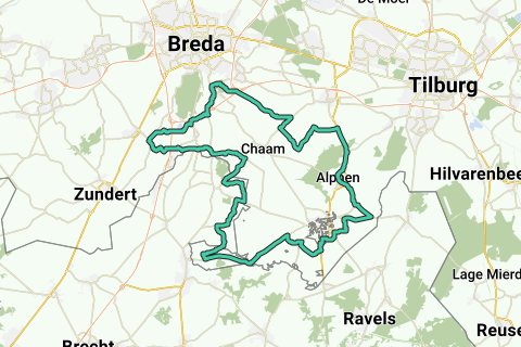De route begint bij de Molen in Ulvenhout en gaat globaal langs Rijsbergen, Strijbeek, Meerle (België) Baarle Nassau, Riel en door de Alphense bossen en langs de Slingerdreef terug naar Ulvenhout.