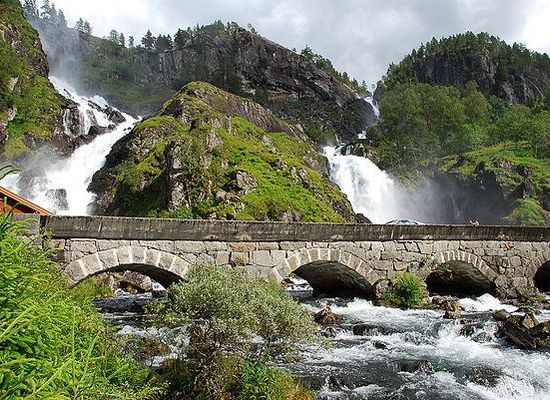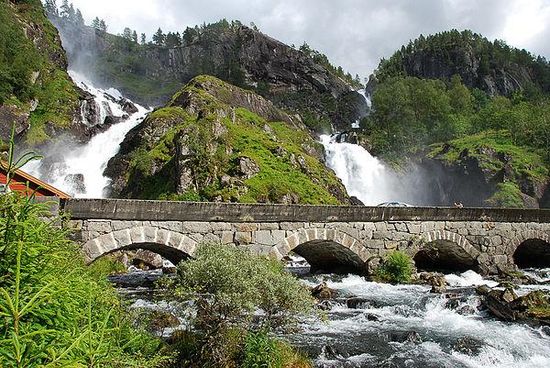 In twee afzonderlijke stromen valt er een enorme hoeveelheid water naar beneden vanuit het Lotevatnet, gelegen op een hoogte van 340 meter. Aan de onderkant van de waterval, vlak voor de oude stenen boogbrug, komen de twee afzonderlijke stromen weer bij elkaar en stroomt onder de brug door in de rivier Grønsdalslona.