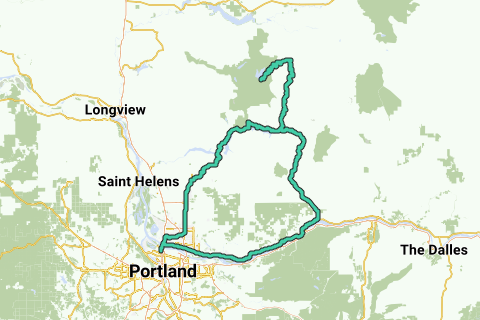 Portland, OR naar Amboy WA. Verder door Cougar, WA en door bosgebied naar het uitzichtpunt Windy Ridge van de Mt. St. Helens. Terug via Stevenson Wa, HWY 14 langs de Columbia River gorge terug naar Portland. Deze reis bestaat voor bijna 50% uit grond van de Amerikaanse bosdienst. Bomen, meren en veel kronkelige wegen. Er zijn veel uitkijkpunten om van te genieten.